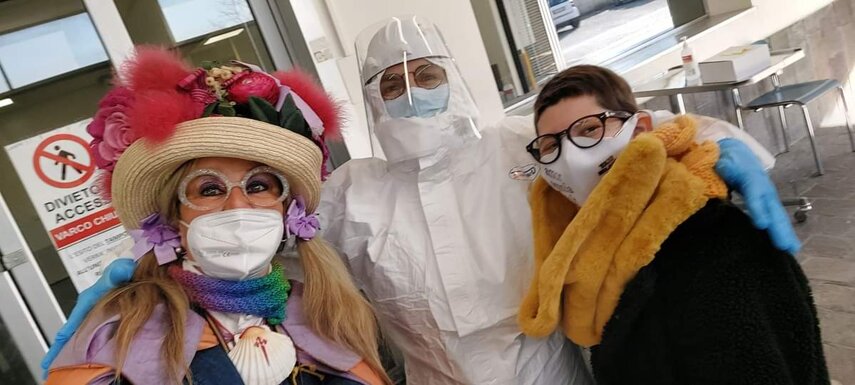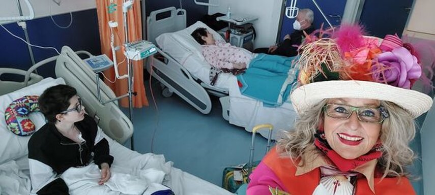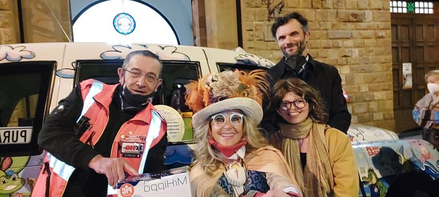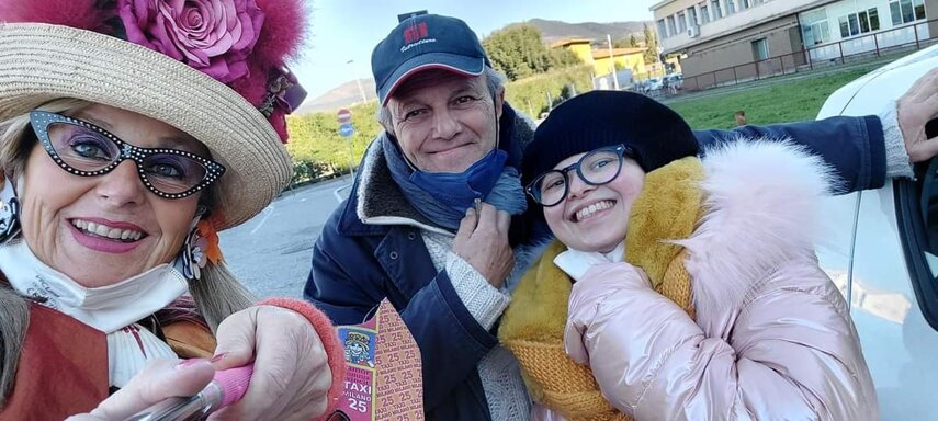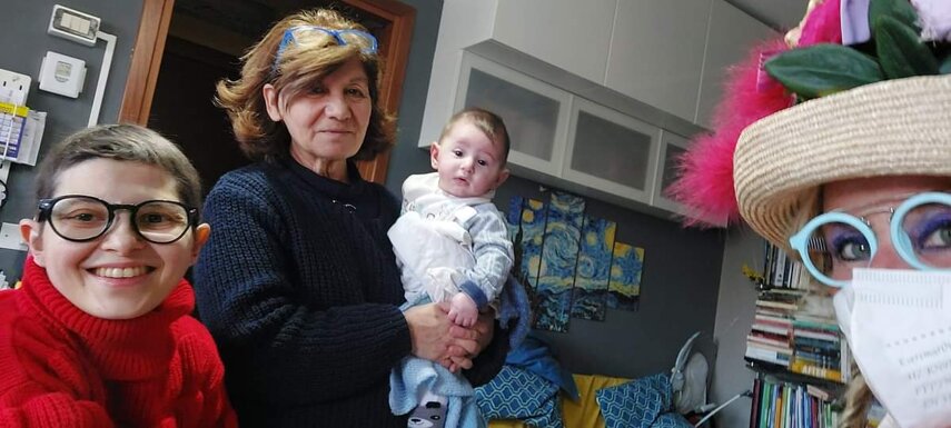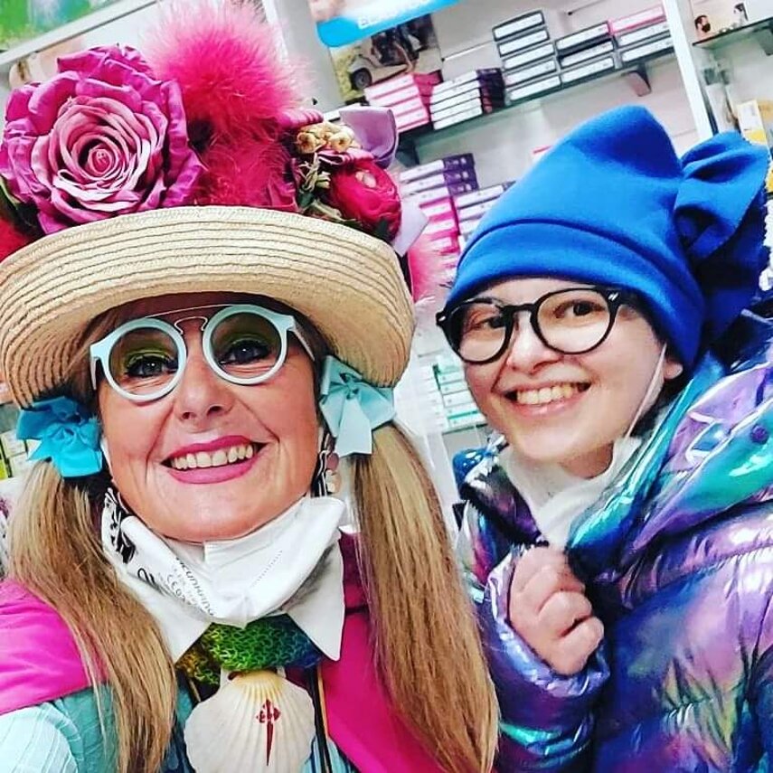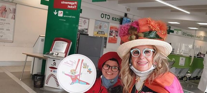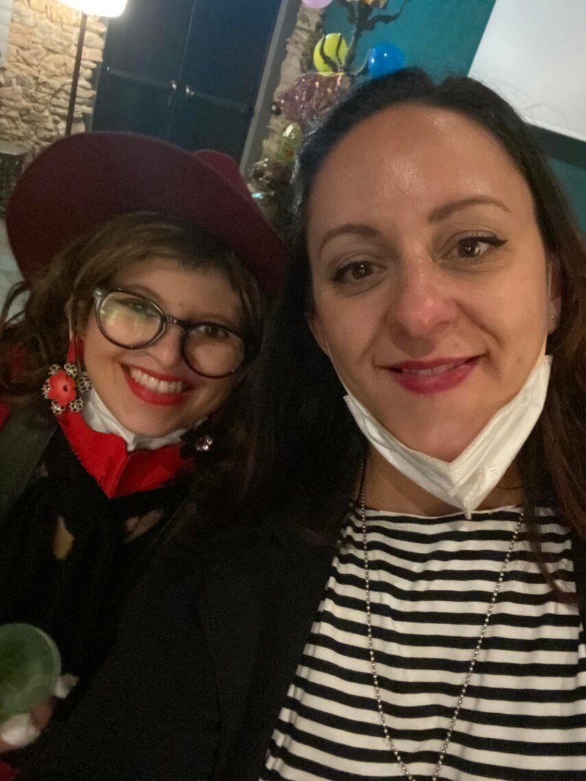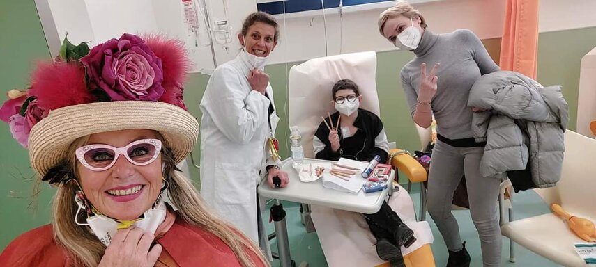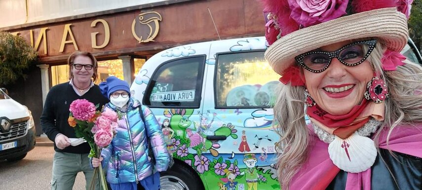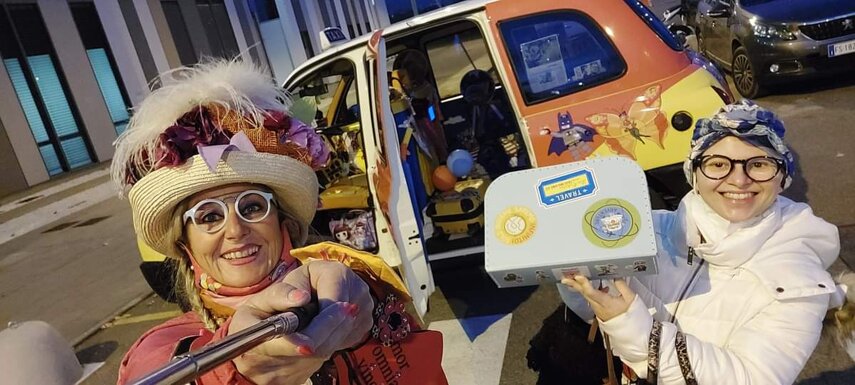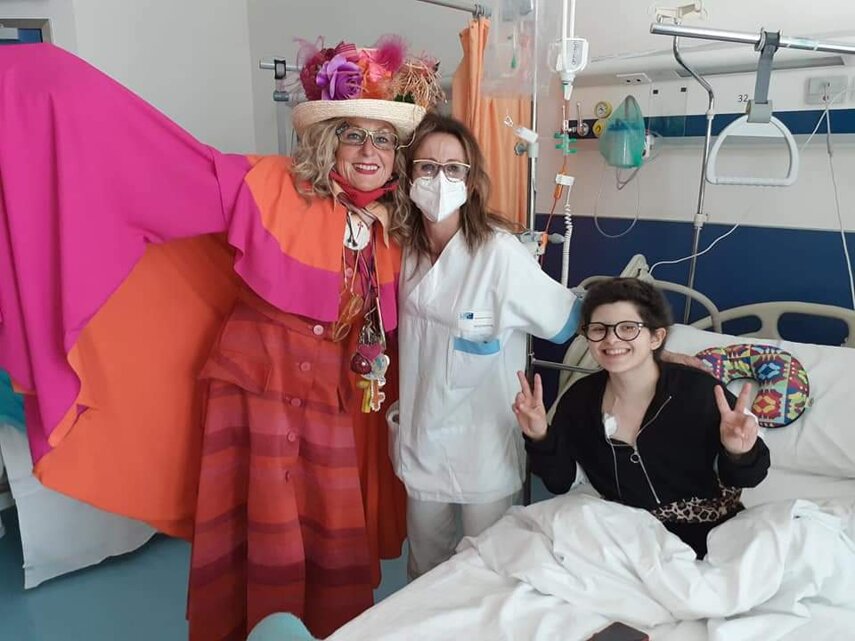 Ho sempre visto la macchina della zia ovunque per Firenze ma non mi ero mai soffermata abbastanza su quello che faceva, né mi ero mai presentata. L'aver cura dell'altro però ha sempre fatto parte di me. Ho fatto cose diverse della zia ma il concetto rimane quello di prendersi cura dell'altro più fragile di te. Quando ho fatto gli scout sono andata insieme al Clan in Albania a giocare con i bambini fragili, a farli godere di alcuni momenti di felicità. Quando ho fatto le due tesi sulla dispersione scolastica sono andata a Scampia a prendere i bambini delle vele e li ho portati insieme ai collaboratori del centro Hurtado a giocare e ad apprendere. Perché è quella la vita che un bambino deve fare. Il bambino è stato sempre il mio centro, il centro dei miei studi. Sono diventata insegnante di sostegno per insegnare e rendermi utile ai più fragili per far capire a tutti che ognuno ha delle potenzialità e non esiste la normalità. Questo per dire che io e zia Caterina eravamo destinate ad incontrarci perché in un certo senso abbiamo la stessa forma mentis. Il vero incontro con zia Caterina è stato ad ottobre 2021 in oncologia. Io stavo aspettando di fare la chemio e seduta in sala d'attesa mi trovo questa maga tutta colorata. È il colore che mi ha attirata più di tutto e il travestimento perché io fino al giorno prima coloravo con i miei bambini a scuola dell'infanzia e il mio posto è lì e voglio tornarci con tutta me stessa perché so che posso ancora dare tanto con il cuore e con la mia professionalità. Zia Caterina intavolò una conversazione: mi chiese con aria seria come avrei fatto io a far capire alle persone che mi circondano ciò che io sto passando. Difficile come domanda perché da quando mi sono ammalata molti amici e parenti sono diventati conoscenti e li ho persi per strada, sono stata delusa e ho capito che era davvero complicato far capire loro cosa stavo provando momento dopo momento, cosa significasse fare una chemio, cosa significasse avere un tumore. Solo la parola spaventa. Da quel momento non ho più lasciato zia Caterina, ho capito che lei doveva entrare nella mia vita perché eravamo fatte della stessa pasta e io per ciò che potevo volevo contribuire ai suoi progetti. Lei mi chiama la *sua bambina* non mi ha partorito lei ma avrebbe potuto sicuramente farlo. Le sono piaciuta e lei è piaciuta a me e tra poco andremo insieme a Napoli. È una donna straordinaria, un vulcano di emozioni e sprigiona colore da tutti i pori, io l'adoro.