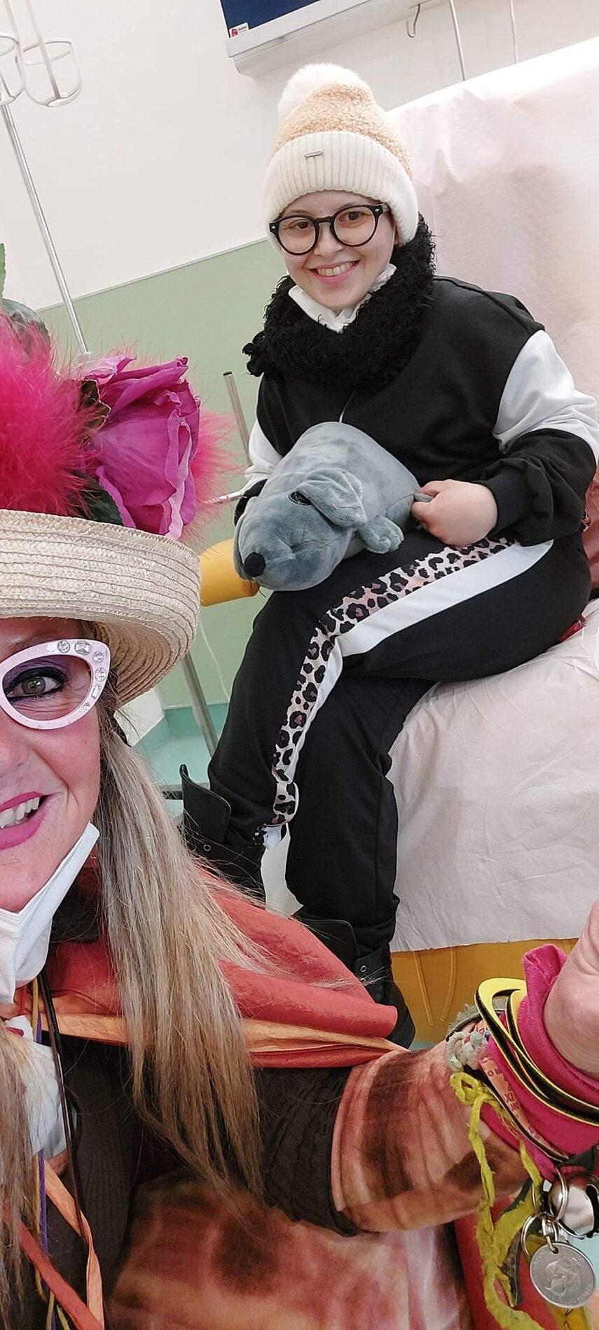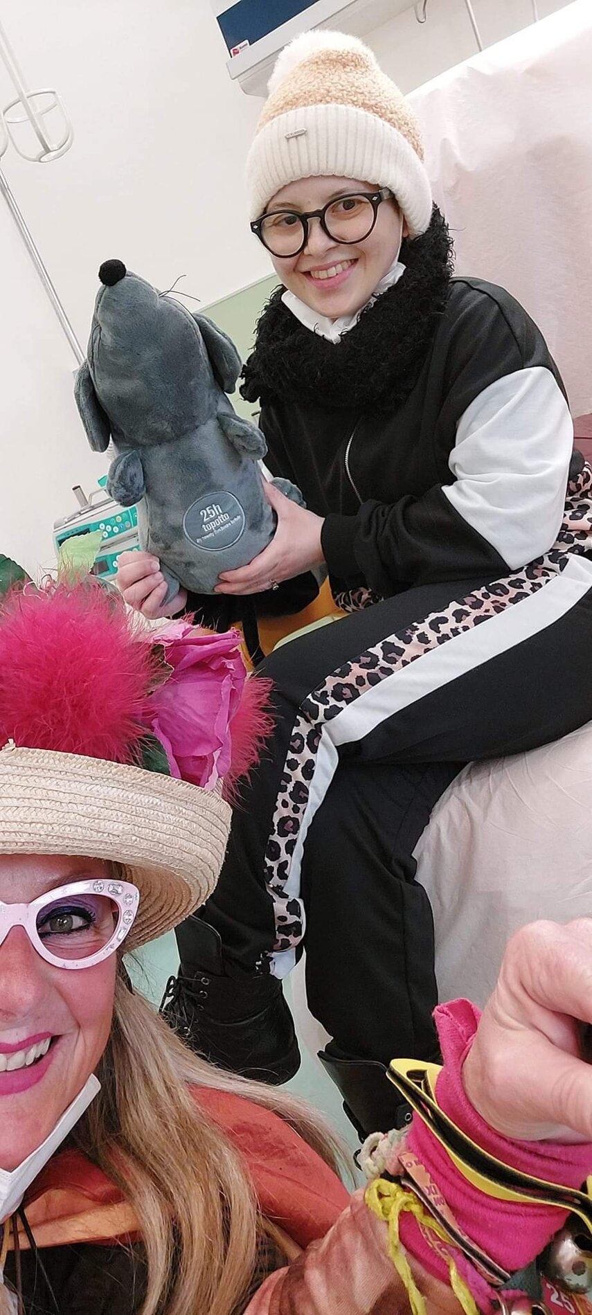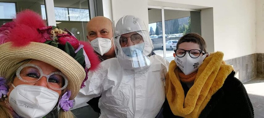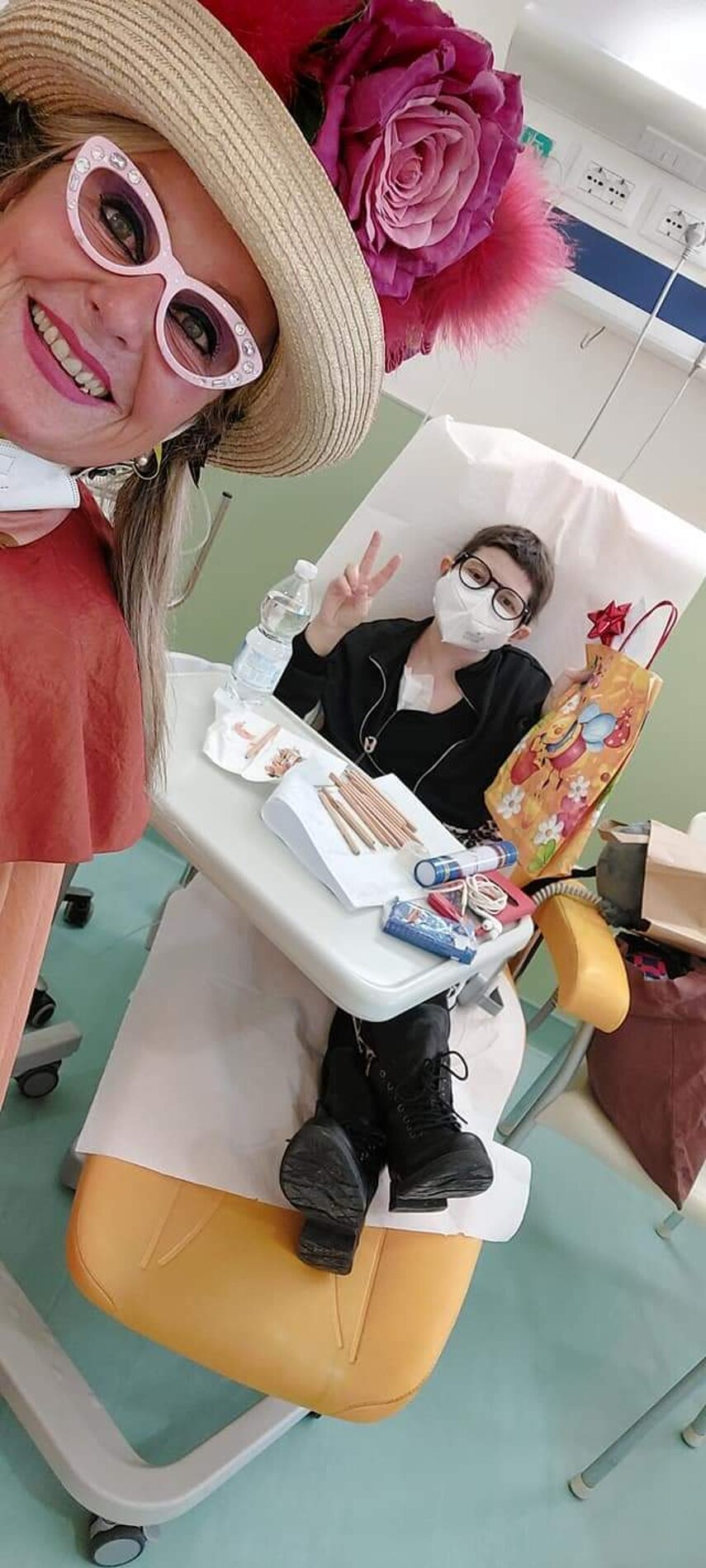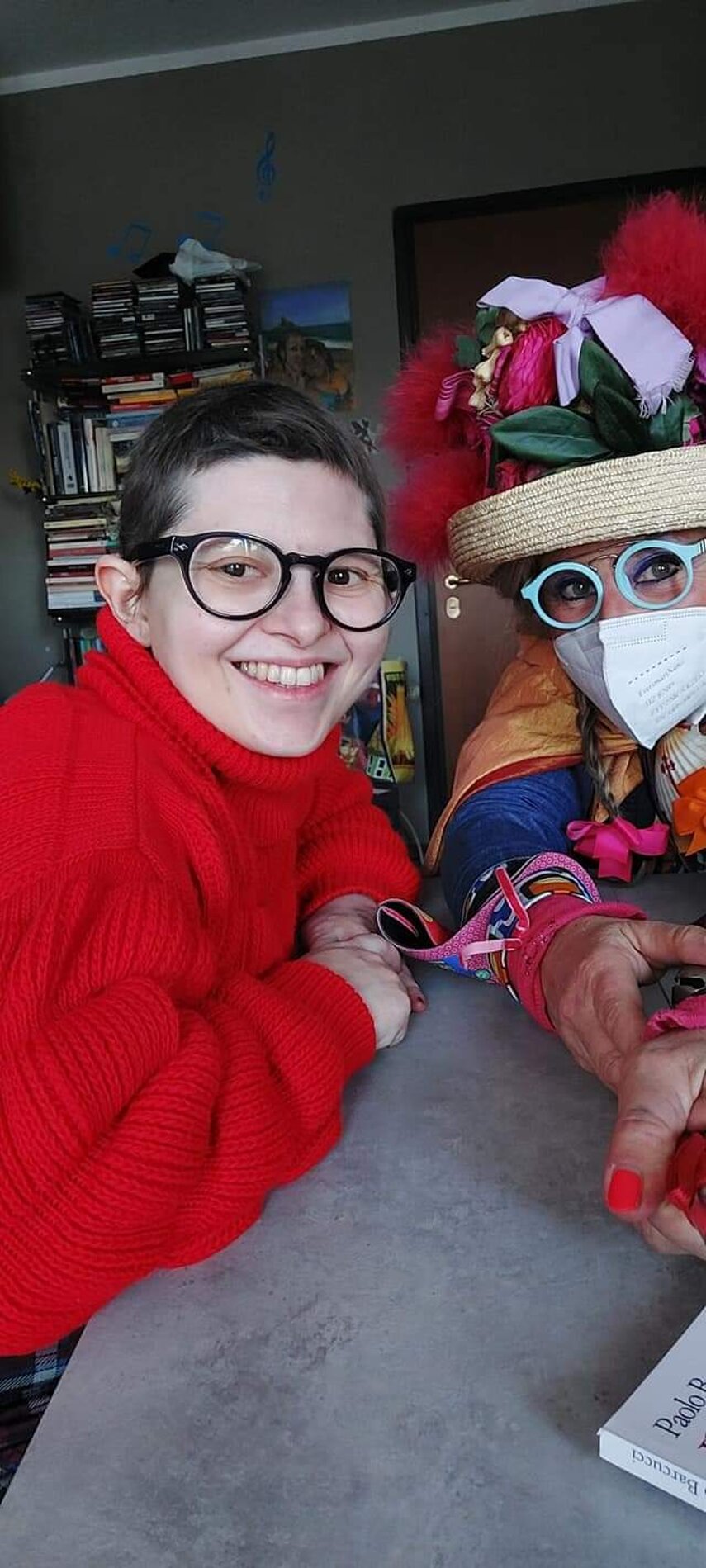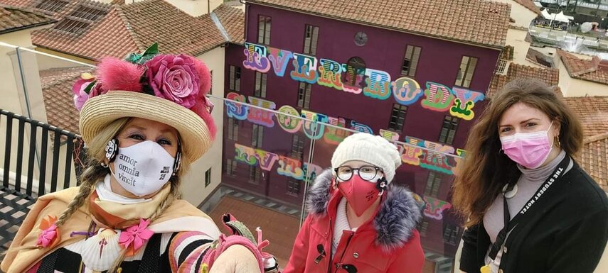 Ho sempre visto la macchina della zia ovunque per Firenze ma non mi ero mai soffermata abbastanza su quello che faceva, né mi ero mai presentata. L'aver cura dell'altro però ha sempre fatto parte di me. Ho fatto cose diverse della zia ma il concetto rimane quello di prendersi cura dell'altro più fragile di te. Quando ho fatto gli scout sono andata insieme al Clan in Albania a giocare con i bambini fragili, a farli godere di alcuni momenti di felicità. Quando ho fatto le due tesi sulla dispersione scolastica sono andata a Scampia a prendere i bambini delle vele e li ho portati insieme ai collaboratori del centro Hurtado a giocare e ad apprendere. Perché è quella la vita che un bambino deve fare. Il bambino è stato sempre il mio centro, il centro dei miei studi. Sono diventata insegnante di sostegno per insegnare e rendermi utile ai più fragili per far capire a tutti che ognuno ha delle potenzialità e non esiste la normalità. Questo per dire che io e zia Caterina eravamo destinate ad incontrarci perché in un certo senso abbiamo la stessa forma mentis. Il vero incontro con zia Caterina è stato ad ottobre 2021 in oncologia. Io stavo aspettando di fare la chemio e seduta in sala d'attesa mi trovo questa maga tutta colorata. È il colore che mi ha attirata più di tutto e il travestimento perché io fino al giorno prima coloravo con i miei bambini a scuola dell'infanzia e il mio posto è lì e voglio tornarci con tutta me stessa perché so che posso ancora dare tanto con il cuore e con la mia professionalità. Zia Caterina intavolò una conversazione: mi chiese con aria seria come avrei fatto io a far capire alle persone che mi circondano ciò che io sto passando. Difficile come domanda perché da quando mi sono ammalata molti amici e parenti sono diventati conoscenti e li ho persi per strada, sono stata delusa e ho capito che era davvero complicato far capire loro cosa stavo provando momento dopo momento, cosa significasse fare una chemio, cosa significasse avere un tumore. Solo la parola spaventa. Da quel momento non ho più lasciato zia Caterina, ho capito che lei doveva entrare nella mia vita perché eravamo fatte della stessa pasta e io per ciò che potevo volevo contribuire ai suoi progetti. Lei mi chiama la *sua bambina* non mi ha partorito lei ma avrebbe potuto sicuramente farlo. Le sono piaciuta e lei è piaciuta a me e tra poco andremo insieme a Napoli. È una donna straordinaria, un vulcano di emozioni e sprigiona colore da tutti i pori, io l'adoro.